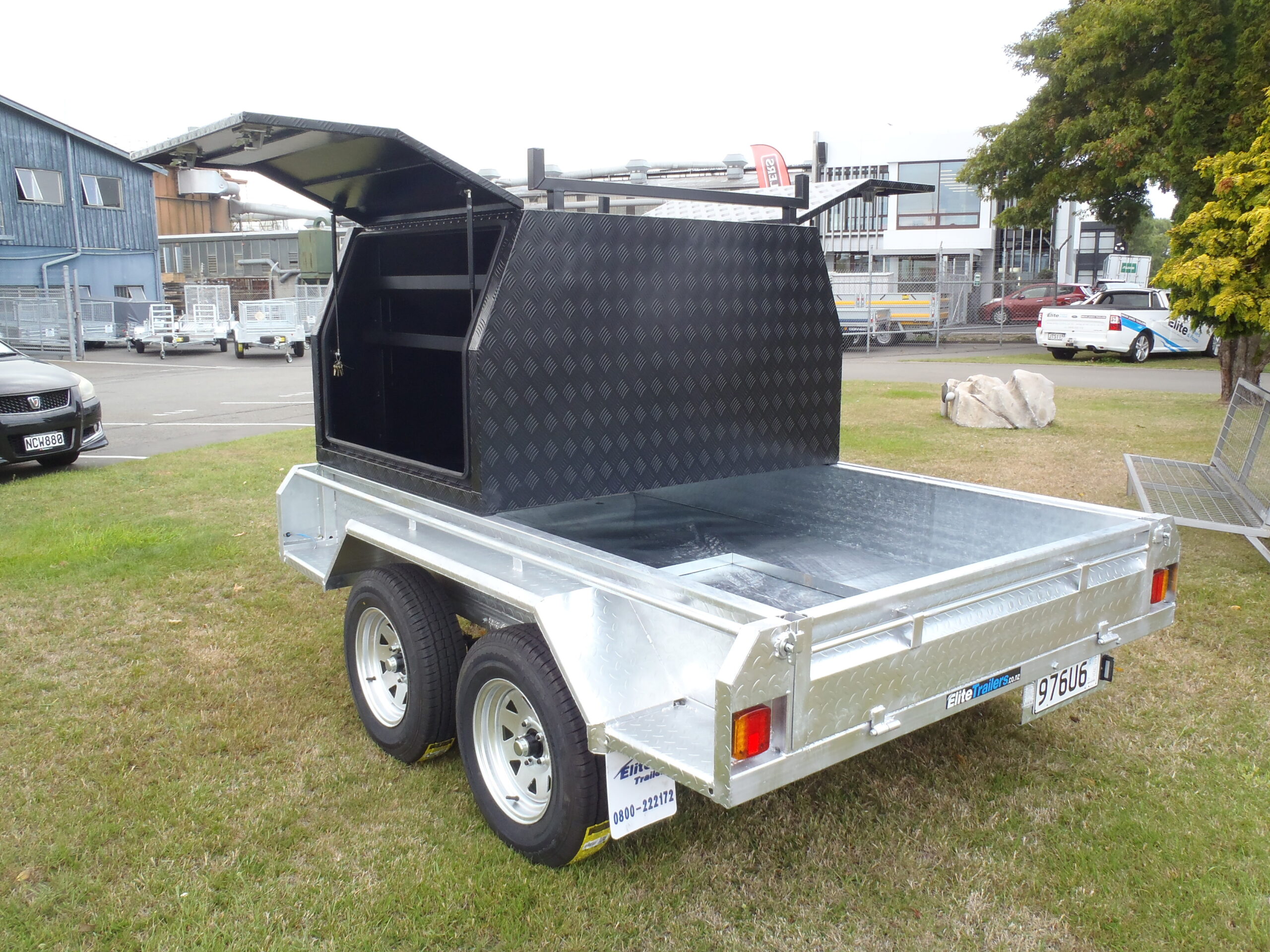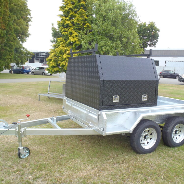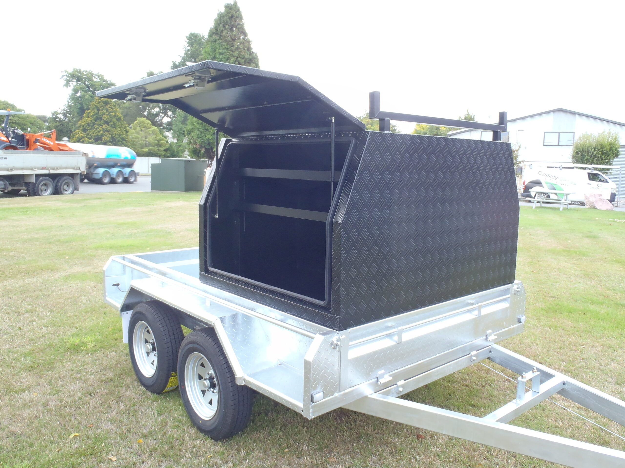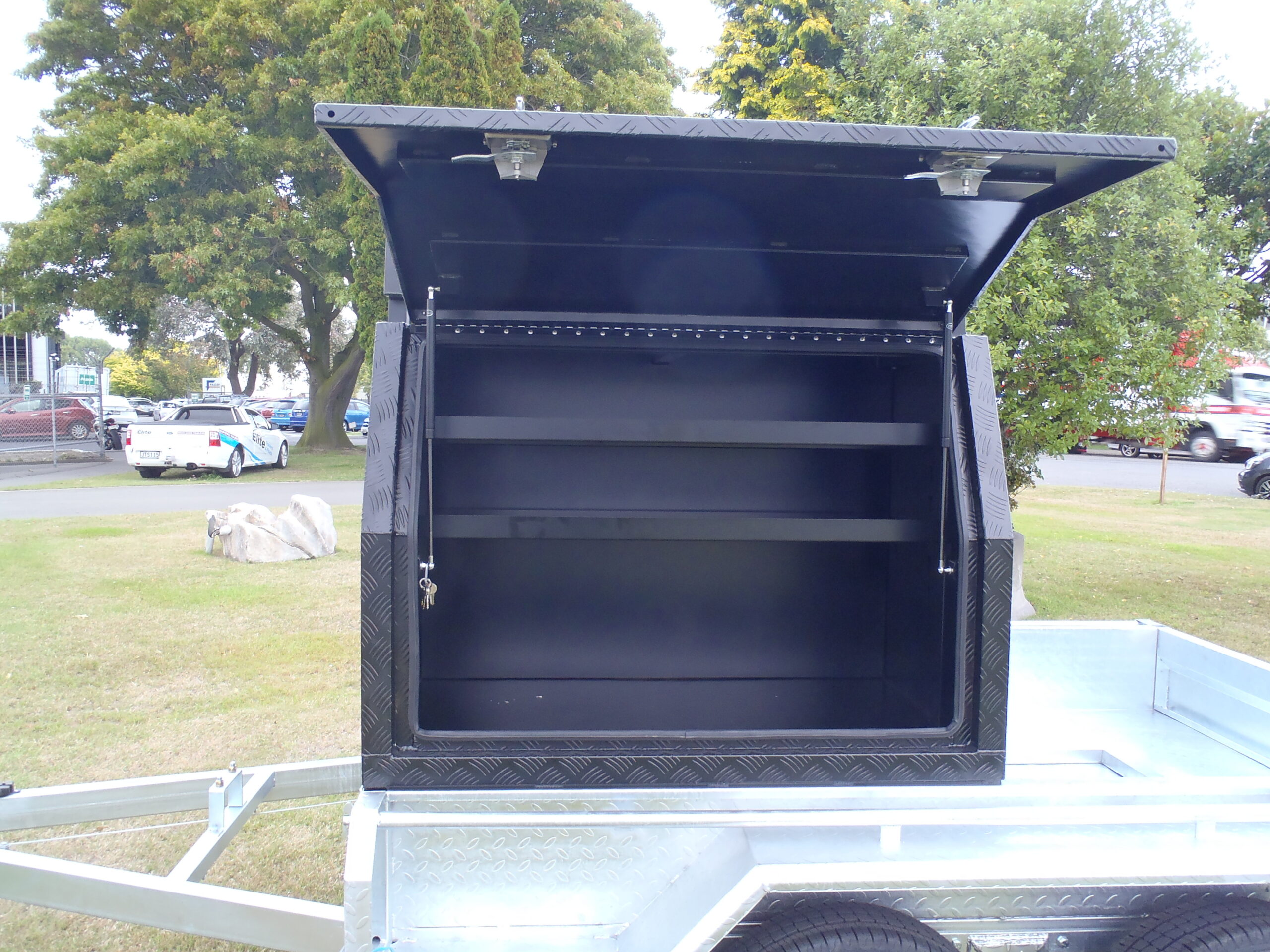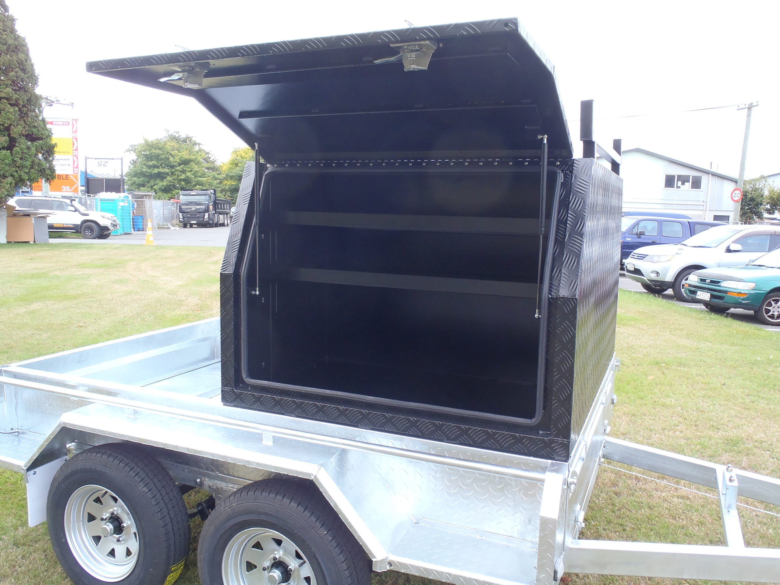 Want extra tool storage but still need some trailer space? If that’s your requirement here’s our popular 8×5 Alloy Top cut down to half size. At 4ft long there’s still 4ft of trailer deck, when fitted to an 8×5 Trailer, or 6ft if mounted on a 10×5 Trailer. Powder Coated inside and out in BLACK.