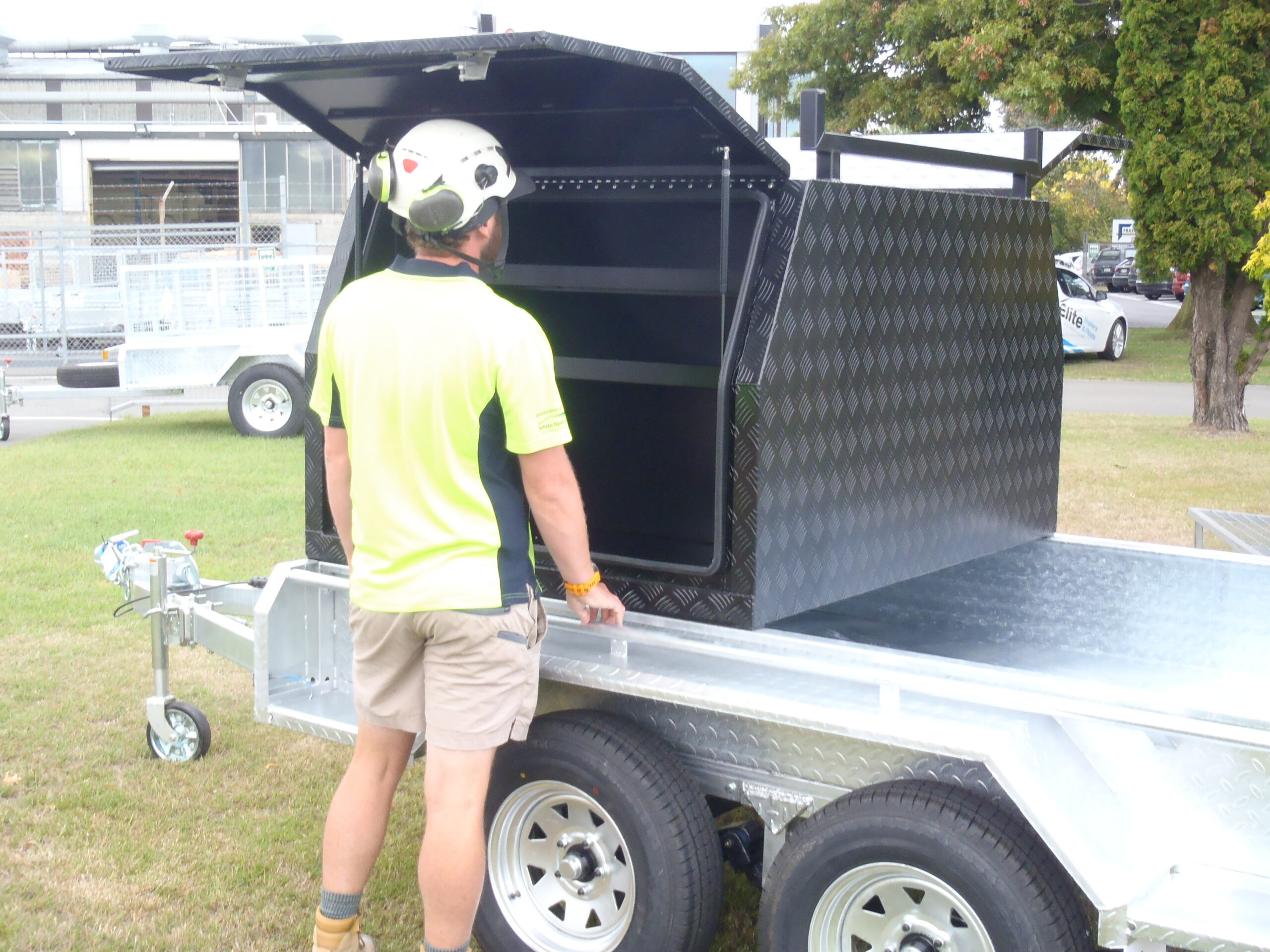 Central dividing wall separates left and right sides Two, height adjustable shelves, on each side. Gullwing side doors with locking latches Solid floor separates the upper tool area from lower trailer deck. Shelves 1170mm x 600 (WxD) Fitted with 2x H-bar Ladder Racks